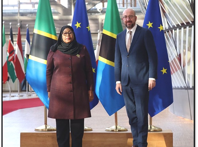 H.E. Samia Suluhu Hassan, President of the United Republic of Tanzania on the left posturing together with H.E Charles Michel, President of the European Council (on the right) at the EU Headquarters in…