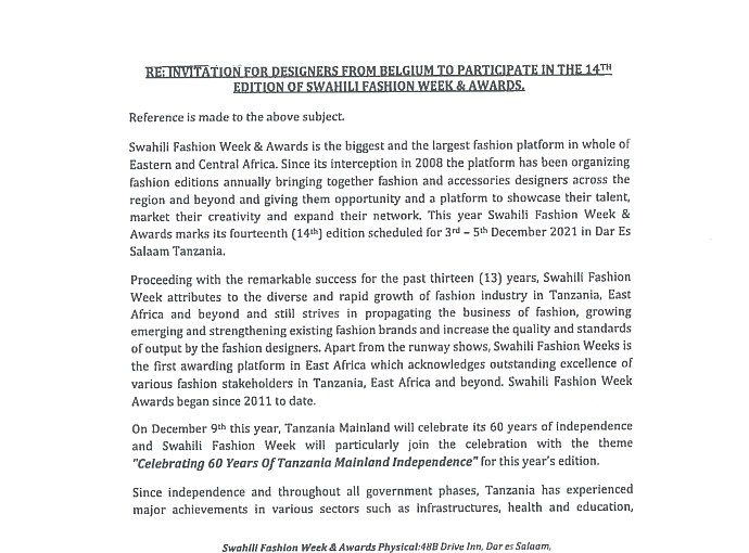 INVITATION FOR DESIGNERS FROM BELGIUM TO PARTICIPATE IN THE 14 TH EDITION OF SWAHILIU FASHION WEEK & AWARDS