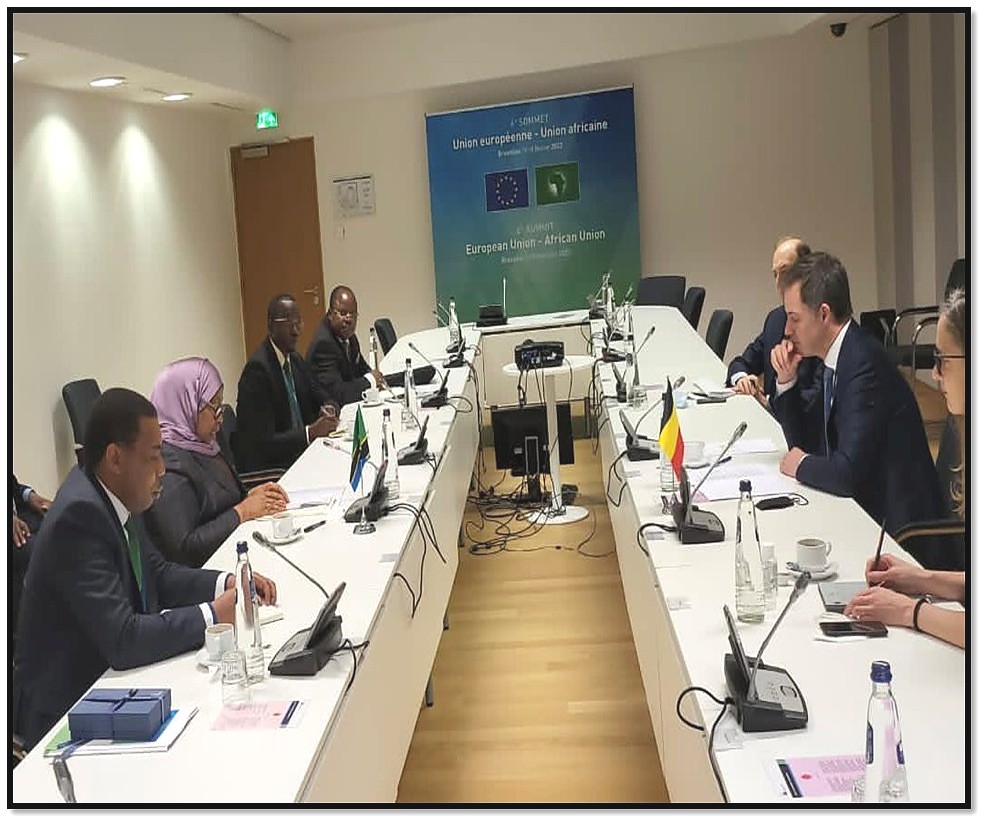 H.E. Samia Suluhu Hassan, President of the United Republic of Tanzania (on the left side) accompanied by some Tanzania delegates having a Bilateral Meeting with Hon. Alexander De Croo, Prime Minister of the Kingdom of Belgium, with his team on the right side. The meeting was held at the ‘Justus Lipsius Building’ EU Headquarters in Brussels, Belgium.