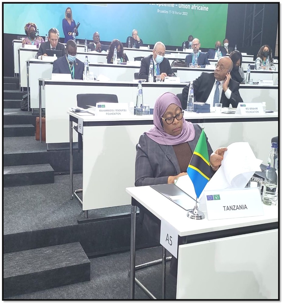 H.E. Samia Suluhu Hassan, President of the United Republic of Tanzania on the fore-ground together with various European Union and African Union leaders attending the 6th European Union-African Union Summit held at the EU Headquarters in Brussels, Belgium on 17th February 2022.