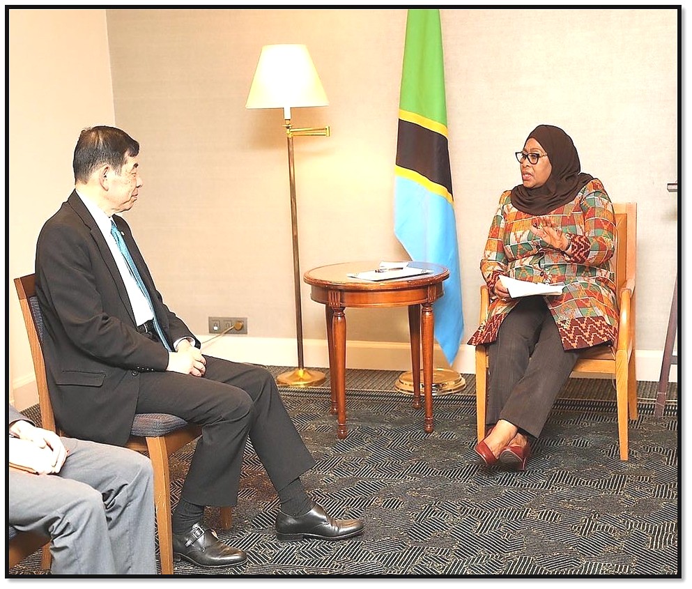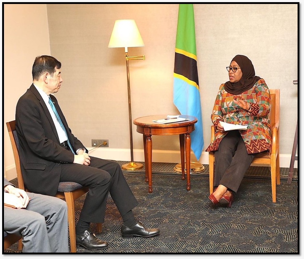 H.E. Samia Suluhu Hassan, President of the United Republic of Tanzania on the right held a Meeting with Hon. Dr Kunio Mikuriya, Secretary-General of World Customs Organisation (on the left) at Le Plaza Hotel Brussels, Belgium H.E Samia had a State visit in Brussels in February 2022. The event took place on Thursday, 17th February, 2022