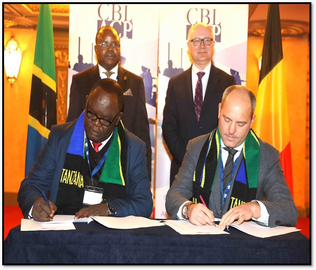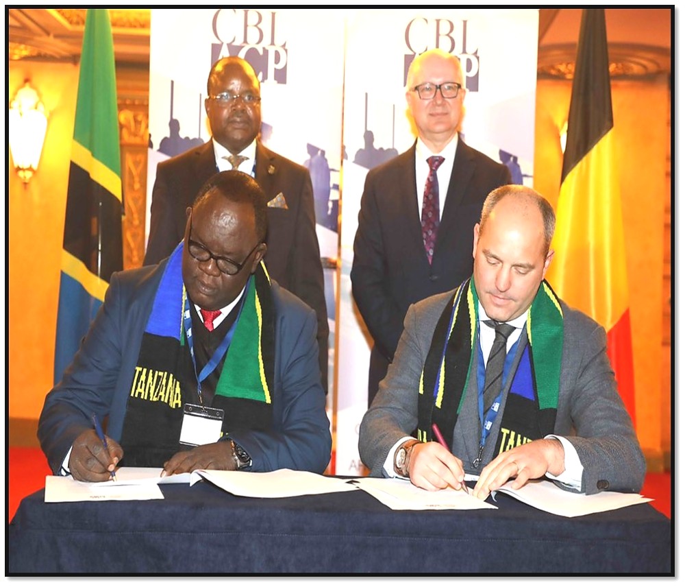 Mr Paul Koyi, the President of the Tanzania Chamber of Commerce, Industry and Agriculture (TCCIA), signed a Memorandum of Understanding (MOU) with his counterpart Mr Amaury Luyckx, the Vice President of the Chamber of Commerce, Industry and Agriculture Belgium – Luxembourg, Africa, Caribbean Pacific (CBL- ACP), (both in the foreground), during the special business forum between Tanzania officials and the CBL-ACP businessmen. The event took place on Thursday, 17th February 2022 at La Plaza Hotel Brussels, Belgium. Witnessing the event from the background are H.E Jestas Abuok Nyamanga, Ambassador of the Embassy of the United Republic of Tanzania – Brussels, Belgium and H.E Ambassador Frank Felix from the Belgium Ministry of Foreign Affairs, Foreign Trade and Development Cooperation.