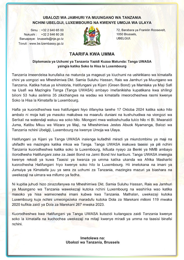 Diplomasia ya Uchumi ya Tanzania Yazidi Kuzaa Matunda: Tanga UWASA yaingia katika Soko la Hisa la Luxembourg
