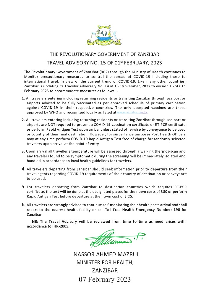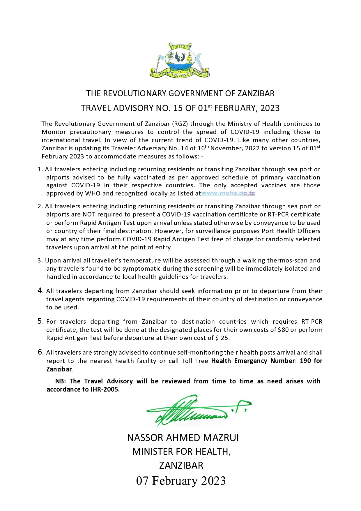 TRAVEL ADVISORY NO. 15 OF 01 FEBRUARY, 2023 - ZANZIBAR